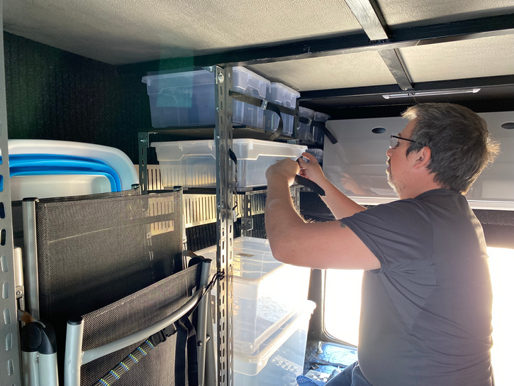 Le barre delle scaffalature sono state accoppiate, per evitare qualsiasi tipo di torsione, se accoppiate a T offrono la possibilità di agganciare delle fettucce per fissare il carico, e l’angolo per fermare i ripiani. Io suddiviso la parete in modalità libera, ovvero oggetti da fissare con le fettucce, come sedie, tavolo, ecc. o in modalità ripiani con box, trasparenti per vedere il contenuto ed in diverse misure.